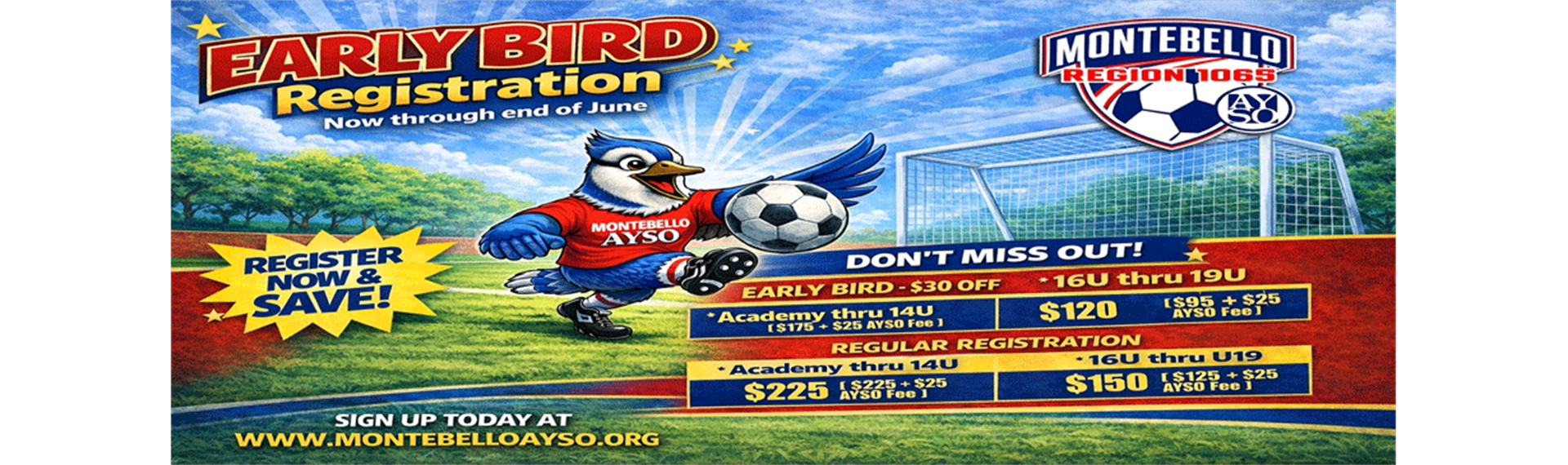 Spring Academy Registration Now OpenRegistration Deadline April 20thApril 4th through May 16thProgram Duration 8 WeeksRegister Onlinewww.aysomontebello.org Come join the fun, build confidence, and develop soccer skills this spring.